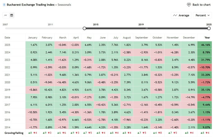 2025 intră în istoria Bursei de Valori Bucureşti drept primul an din 2004 încoace în care indicele BET a avut practic doar o singură lună negativă, aprilie, în timp ce restul anului a fost dominat de creşteri aproape neîntrerupte, într-un raliu care a dus piaţa la maxime istorice şi la una dintre cele mai bune performanţe din Europa.