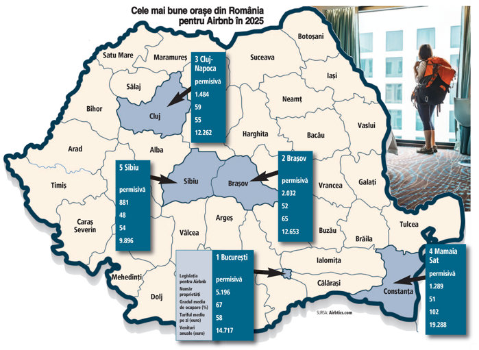 ♦ Bucureştiul se înscrie în top 50 cele mai bune oraşe din Europa în care să închiriezi un apartament Airbnb. Cu peste 5.300 de proprietăţi listate pe platforma de rezervări, proprietarii din Bucureşti pot ajunge şi la un venit anual de 14.600 de euro ♦ Tariful mediu de cazare pe zi este aproape dublu pentru apartamentele din Mamaia, de circa 102 euro, decât cele din Bucureşti, unde tariful mediu e de 58 de euro.