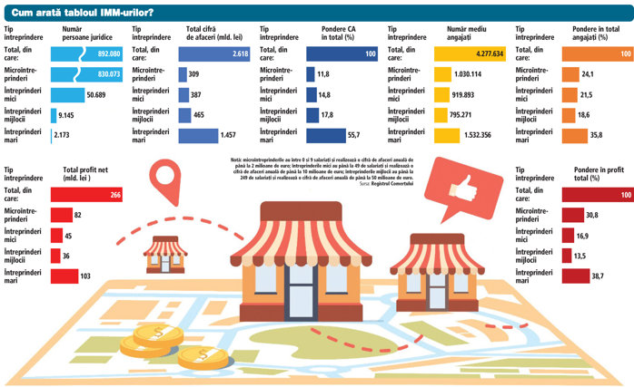 Analiza de luni. Cum arată tabloul economiei locale? Firmele mari obţin cele mai multe venituri, însă IMM-urile se dovedesc a fi mai profitabile şi plătesc salariile a 64% din angajaţii din economie. În 2016, IMM-urile aveau 50% din cifra totală de afaceri, iar an de an procentul a scăzut până în 2022 la circa 45%