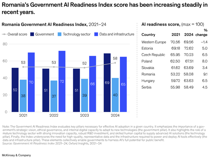 Inteligenţa artificială generativă (GenAI) ar putea fi utilizată pentru a automatiza un procent uriaş din sarcinile administrative din instituţiile publice din România - până la 60% - de două ori mai mult decât ar fi fost posibil cu tehnologiile mai vechi, astfel că într-un an de zile câştigurile de productivitate s-ar putea ridica la un miliard de euro, conform unei noi analize McKinsey, cu titlul “Potenţialul transformator al AI în sectorul public din România”. Conform analizei adoptarea pe scară largă a GenAI ar putea adăuga 30-50 de miliarde de euro la PIB-ul României până în 2040.