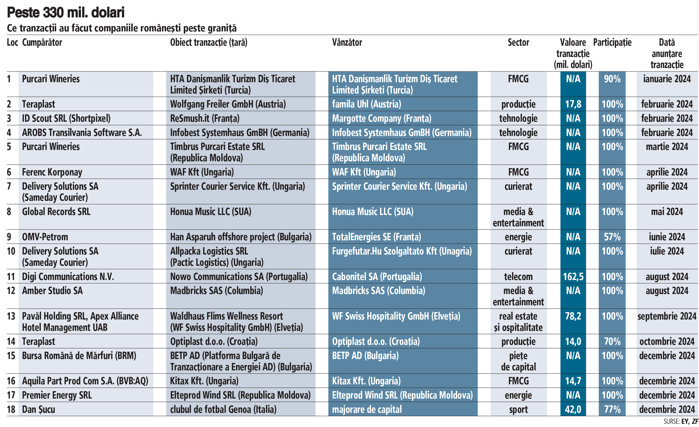 Analiză ZF. Afacerile româneşti prind curaj să treacă graniţele şi să facă achiziţii. În 2024, companiile autohtone au scos din buzunare 330 mil. dolari pentru a cumpăra 18 businessuri din regiune, dar şi din SUA, Italia sau Austria
