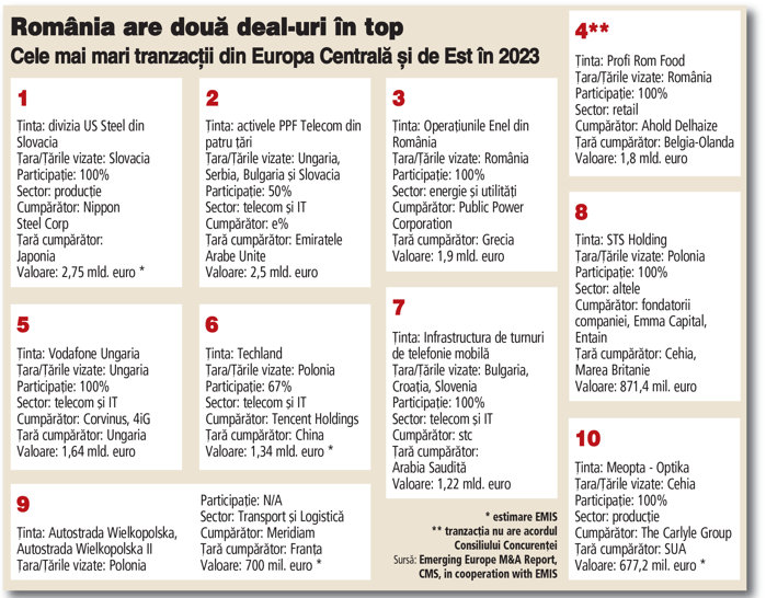 Analiză ZF. Cele mai mari 10 tranzacţii din Europa Centrală şi de Est în 2023: pentru prima dată, România are două deal-uri în top. Cel mai frecvent, piaţa locală şi-a făcut loc în acest top datorită unor deal-uri regionale, ce au implicat şi un anume business în România