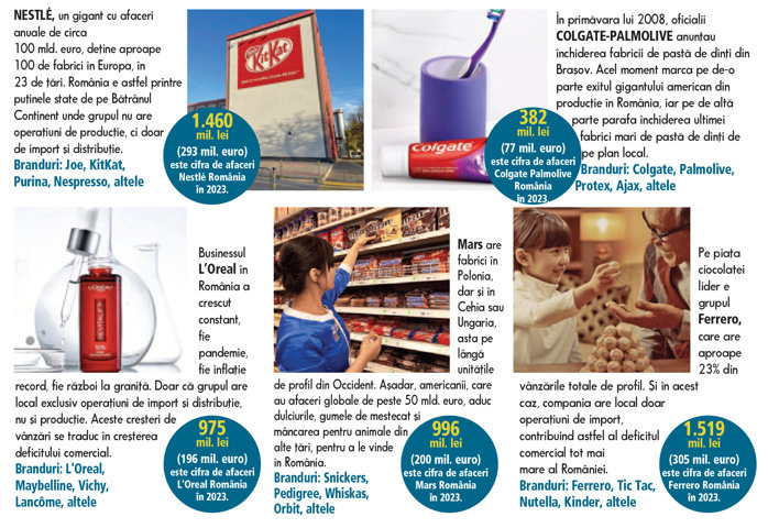 ANALIZĂ ZF. Cinci multinaţionale gigantice din FMCG produc României un deficit comercial de 1 miliard de euro pe an. Nestlé, L’Oreal, Mars, Ferrero şi Colgate-Palmolive văd piaţa locală drept una de consum, mai degrabă decât una optimă pentru investiţii în fabrici