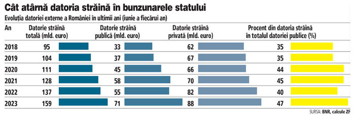 ♦ În urmă cu câţiva ani, datoria externă a statului însemna cam o treime din totalul datoriei externe ♦ Acum datoria externă a ajuns, la jumătate de an, să însemne 47% din totalul datoriei ♦ Şi nici asta nu ar fi o problemă, dacă costul împrumuturilor de pe pieţele externe nu ar fi mult mai mare decât împrumuturile de pe pieţele interne.