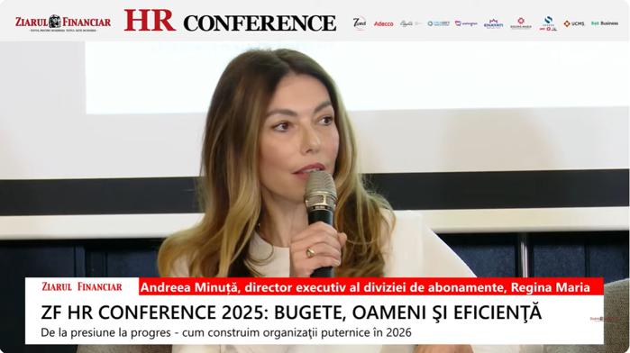 Bugetele companiilor pentru servicii medicale continuă să crească semnificativ, a spus Andreea Minuţă, director executiv al diviziei de abonamente din cadrul reţelei Regina Maria, prezentă în cadrul conferinţei ZF HR Conference 2025: Bugete, oameni şi eficienţă. De la presiune la progres - cum construim organizaţii.