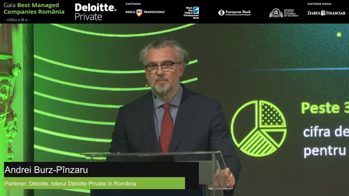 Andrei Burz-Pînzaru, liderul Deloitte Private în România: „La această ediţie au participat peste 100 de companii antreprenoriale, 30 au intrat în faza a doua, dintre acestea şase au primit certificarea Best managed Companies, iar alte 14 au fost recertificate. Aceste 30 de firme au o cifră de afaceri cumulată de peste 3,5 mld. de euro şi 9.200 de angajaţi”
