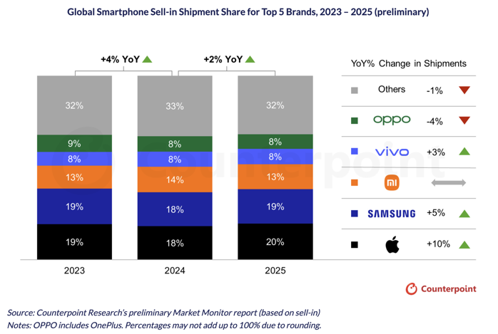 Gigantul american Apple a devenit lider pe piaţa globală de smartphone-uri în 2025, cu o cotă de 20% şi o creştere a livrărilor de 10% faţă de anul precedent - cea mai mare creştere dintre primele cinci branduri - arată estimările preliminare ale companiei de cercetare de piaţă Counterpoint Research.