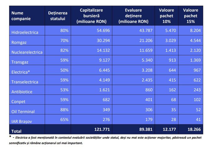 Statul român ar putea atrage între 12 şi 18 miliarde de lei prin vânzarea unor pachete suplimentare de acţiuni la companii precum Hidroelectrica (H2O), Romgaz (SNG) şi Nuclearelectrica (SNN), fără să piardă controlul asupra acestora, arată o analiză realizată de CFA România, asociaţia profesioniştilor în investiţii. O astfel de strategie ar putea fi implementată rapid, fie prin plasamente private accelerate, fie prin oferte secundare de vânzare de acţiuni, şi ar presupune cedarea unor participaţii de 5–10% din capitalul social.