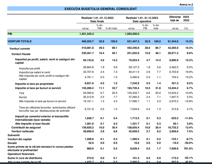 Veniturile bugetului de stat au fost de 521 mld. lei, în creştere cu 13% faţă de 2022, aproape de creşterea bugetată la început de an, de 14%. În aceeaşi vreme, cheltuielile bugetare au fost de 612 mld. lei, adică în creştere cu 13%, faţă de o bugetare de creştere cu 10%. Astfel, deficitul bugetar a fost de 90 mld. lei, mai mare cu 20 mld. lei decât bugetarea de la început de an, de 70 mld. lei.
