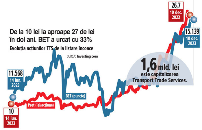 Bursă. Acţiunile Transport Trade Services s-au apreciat de la începutul anului cu 133% pe un indice BET în creştere cu 30%. Ce spun brokerii despre perspectivele şi evaluarea companiei