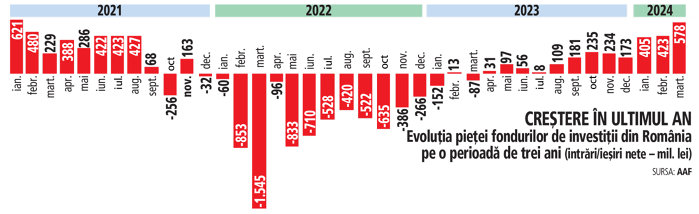 Bursă. Activele pieţei fondurilor de investiţii din România, în creştere cu 1,6 mld. lei luna trecută şi 3,2 mld. lei în T1. Intrări nete de 578 mil. lei în martie, cel mai ridicat nivel din ianuarie 2021. Numărul de investitori, în creştere cu 58.000 în primele trei luni din an