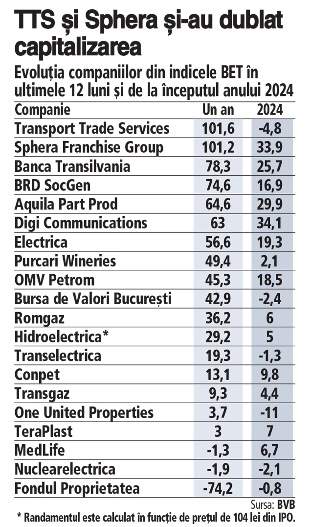 Bursă. Banca Transilvania, OMV Petrom şi Hidroelectrica au susţinut în cea mai mare parte aprecierea indicelui principal BET cu 44% în ultimul an la maxim istoric. Alte acţiuni cu ponderi mai mici în indice, precum TTS şi Sphera, şi-au dublat valoarea. MedLife şi Nuclearelectrica sunt pe minus.