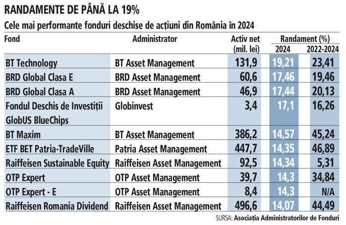 Bursă. Care au fost cele mai performante fonduri de acţiuni în 2024. Randamente de la 14% pentru Raiffeisen România Dividend la 19% în cazul BT Technology