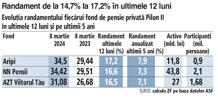Bursă. Ce randament are fiecare fond de pensie privată Pilon II în ultimele 12 luni. Performanţele din ultimele 12 luni arată astfel: 17,2% pentru Aripi, 16,6% pentru NN Pensii, 16,5% pentru AZT Viitorul Tău, 16,1% pentru Metropolitan, 15,8% pentru BCR Pensii, 15,3% pentru Vital, 14,7% pentru BRD Pensii