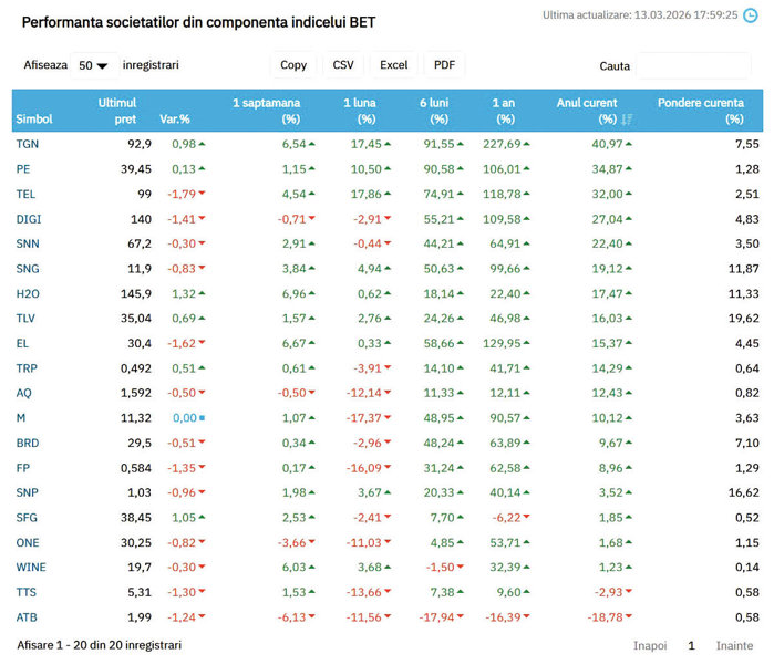Bursă. Cum arată până acum în 2026 evoluţia marilor acţiuni listate: Transgaz, Premier Energy, Transelectrica, aprecieri de 30-40%, Romgaz 20%, Hidro şi Banca Transilvania 17%, Petrom 4%. Antibiotice, minus 18%