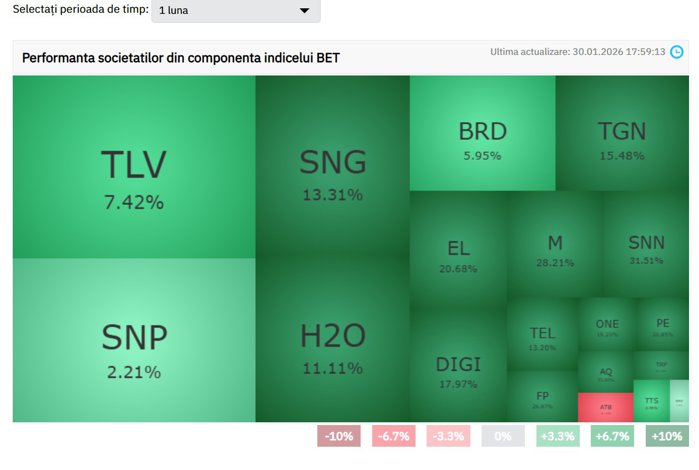 Bursa de Valori Bucureşti a consemnat în ianuarie 2026 cea mai bună lună din ultimii 14 ani din perspectiva creşterii indicelui BET, care a urcat cu 11,26%, cel mai rapid ritm lunar din ianuarie 2012 încoace, pe fondul continuării raliului început la finalul lui 2025 şi al revenirii apetitului investitorilor pentru risc.