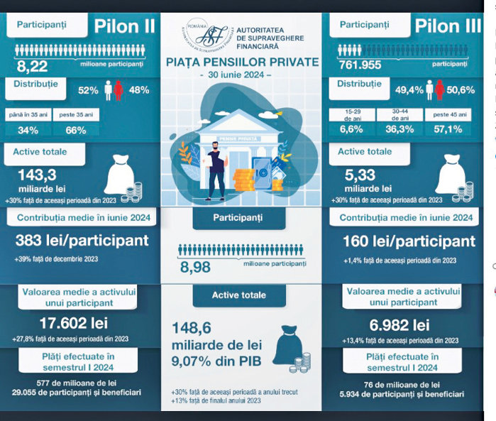 Bursă. Infografic: Activele Pilon II şi Pilon III au crescut cu 30% în ultimul an, până la 149 mld. lei. Numărul celor care contribuie a ajuns la 9 milioane de români, plus 2,8%