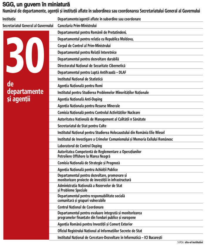 ♦ Ministerele României şi SGG au, împreună, 164 de entităţi în subordine sau în coordonare ♦ Doar SGG are în subordine 30 de entităţi, un mini-guvern ♦ După SGG, Ministerul Educaţiei, Ministerul Afacerilor Interne şi Ministerul Agriculturii au cele mai multe entităţi în subordine ♦ „Nimeni nu contestă nevoia de a avea profesori, personal medical sau din zona de apărare  - poliţie, armată - , dar nu acolo este creşterea masivă. Administraţia publică centrală şi cea locală au crescut necontrolat.”