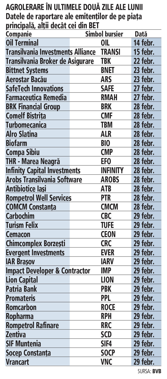 Când raportează companiile de pe piaţa principală a BVB, altele decât cele incluse în indicele BET: zilele acestea, Oil Terminal şi Transilvania Investments Alliance