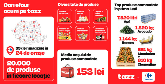 „Suntem un retailer centrat pe client, iar asta ne determină să venim constant cu soluţii adaptate nevoilor moderne de consum. Prin extinderea prezenţei noastre digitale în aplicaţia Tazz, ne dorim să le oferim românilor multiple posibilităţi de cumpărare la doar un click distanţă. Colaborarea cu Tazz reprezintă o nouă oportunitate de a ne consolida poziţia pe piaţa de e-commerce în categoria grocery şi reflectă principalele axe strategice ale companiei noastre – proximitate, calitate, accesibilitate”, a declarat Narcis Horhoianu, Chief Marketing Officer & E-commerce, Carrefour România.Comanzi produsele preferate din Carrefour şi te bucuri de mai mult timp liberDin secţiunea Supermarket a aplicaţiei, poţi selecta produsele dorite de la hipermarketul Carrefour din oraşul tău, iar Tazz le va livra la adresa indicată în mai puţin de 60 de minute.Carrefour pune la dispoziţie cea mai extinsă listă de produse din portofoliul Tazz, peste 20.000 de articole alimentare şi non-alimentare per locaţie, din categorii precum: legume şi fructe, produse lactate, produse de băcănie, băuturi, produse cosmetice şi de îngrijire, produse de curăţenie sau hrană pentru animalele de companie. Astfel, poţi adăuga în coşul de cumpărături o varietate de fructe şi legume proaspete româneşti, mărci proprii precum Drag de România sau Carrefour La Piaţă, produse Bio, o selecţie extinsă de vinuri, inclusiv de la producătorii locali şi regionali, produse proaspete locale şi internaţionale şi multe altele.Toate produsele listate în aplicaţia Tazz pot fi cumpărate la aceleaşi preţuri ca în magazin, alături de numeroase opţiuni pentru o alimentaţie sănătoasă la preţuri accesibile, dar şi oferte şi promoţii periodice.Topul produselor comandate prin Tazz, de la Carrefour În prima lună de parteneriat, în topul produselor comandate de români se află pătrunjelul proaspăt, roşiile cherry, castraveţii, pâinea, apa îmbuteliată, ceapa verde românească, ardeii kapia şi morcovii. Totodată, nici fructele nu lipsesc de pe lista cu produse favorite. Din totalul comenzilor plasate de utilizatorii aplicaţiei la Carrefour, riderii colaboratori Tazz au livrat 1.144 kg de banane, 1.520 kg de avocado, peste 650 kg de mandarine şi clementine, 72 kg de căpşuni şi 39 kg de zmeură.În medie, românii au pus în coş produse în valoare de aproximativ 153 de lei. Totuşi, platforma a înregistrat şi unele comenzi mai generoase. Din punct de vedere al cantităţii, cel mai mare coş de cumpărături a adunat în total 153 de produse într-o singură comandă, în timp ce cea mai mare comandă din punct de vedere valoric a fost de 1.450 de lei.În prezent, Carrefour oferă clienţilor acces la un univers extins de produse atât prin intermediul celor patru formate de magazine fizice, a partenerilor din sfera digitală, dar şi prin propriile platforme digitale cu servicii de e-commerce incluse, carrefour.ro şi aplicaţia Carrefour.