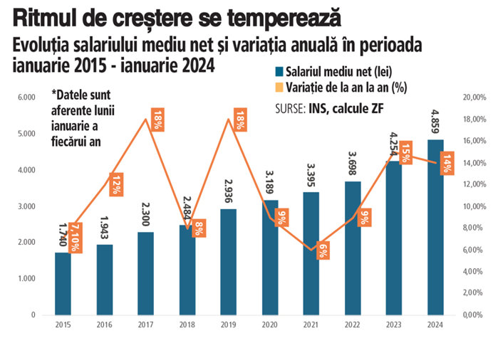 Câştigul salarial mediu net lunar a crescut în ianuarie cu 14%, an/an, cu mult peste inflaţie. În ianuarie 2024, câştigul salarial mediu net pe economie a ajuns la 4.859 de lei, în scădere faţă de luna precedentă, când spărsese pragul de 5.000 de lei.
