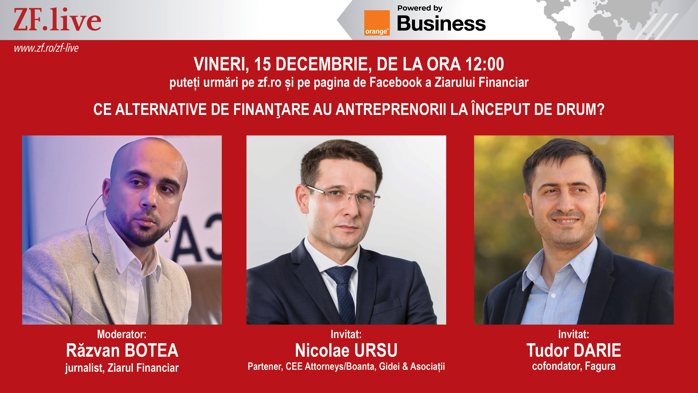 Ce alternative de finanţare au antreprenorii la început de drum? Cum funcţionează zona de crowdfunding pentru business? Urmăriţi ZF Live vineri, 15 decembrie, ora 12:00 - o discuţie cu NICOLAE URSU, partener, CEE al Attorneys/Boanta, Gidei şi Asociaţii şi TUDOR DARIE, cofondator al Fagura