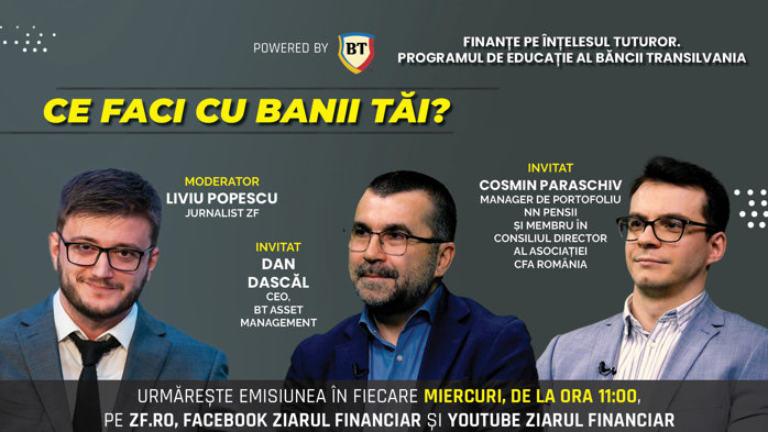 CE FACI CU BANII TĂI? Am o sumă de bani şi vreau să o investesc. Cum aleg fondul de investiţii sau fondul de pensii potrivit? Care sunt diferenţele între cele două? Urmăriţi o discuţie miercuri, 12 martie, de la ora 11:00 cu Dan Dascăl, CEO, BT Asset Management şi Cosmin Paraschiv, manager de portofoliu NN Pensii şi membru în Consiliul Director al Asociaţiei CFA Romania