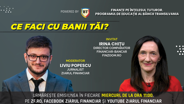 CE FACI CU BANII TĂI? Credite vs investiţii, dobânzi vs randamente. Urmăriţi o discuţie miercuri, 18 decembrie 2024, de la ora 11.00 cu IRINA CHIŢU, Director Comparator Financiar-Bancar, Finzoom.ro