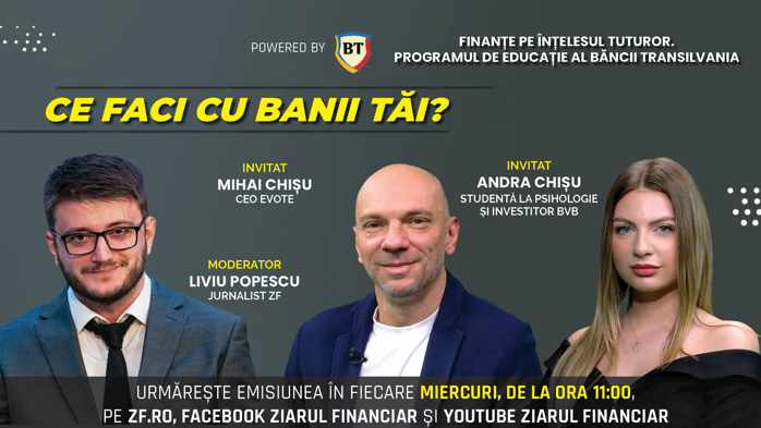 CE FACI CU BANII TĂI? Cum discuţi în familie despre bani? Cum îi prezinţi copilului conceptul de investiţii? Relaţia părinţi – copii în materie de investiţii. Urmăriţi o discuţie miercuri, 11 decembrie 2024, de la ora 11.00 cu MIHAI CHIŞU, CEO al eVote şi ANDRA CHIŞU, studentă la Psihologie şi investitor BVB