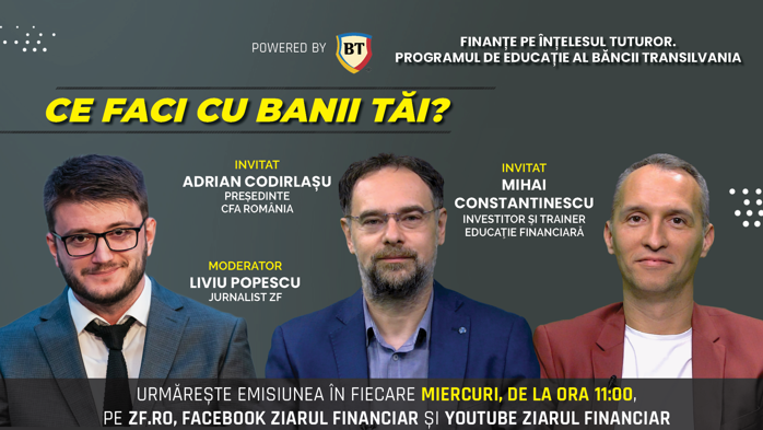 CE FACI CU BANII TĂI? Cum să te comporţi cu banii? Important este nu ce ştii despre investiţii, ci cum reacţionezi. Urmăriţi o discuţie miercuri, 22 ianuarie 2025, de la ora 11.00 cu ADRIAN CODIRLAŞU, preşedinte CFA România şi MIHAI CONSTANTINESCU, investitor şi trainer educaţie financiară