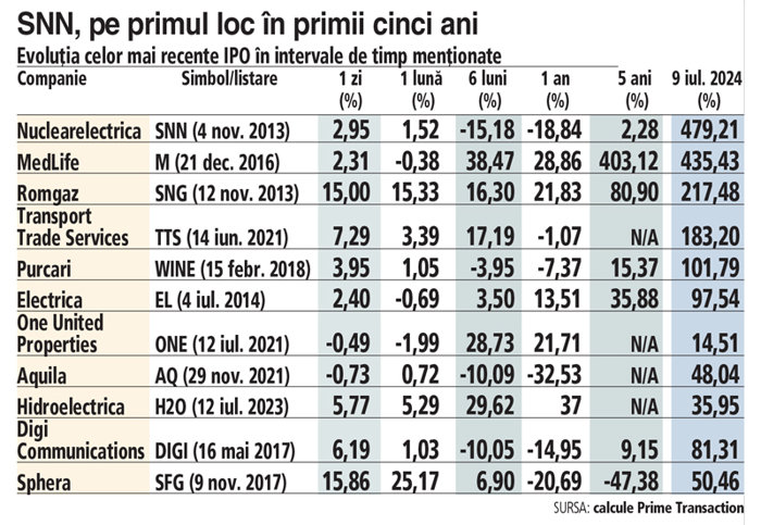 Ce randamente au livrat marile listări de la BVB în prima lună, primul an, primii cinci ani şi până astăzi. Şi mai important, cum au evoluat faţă de piaţă. Cele mai mari cinci randamente de la listare încoace sunt la SNN (479%), MedLife (435%), Romgaz (217%), TTS (183%), Purcari (102%)