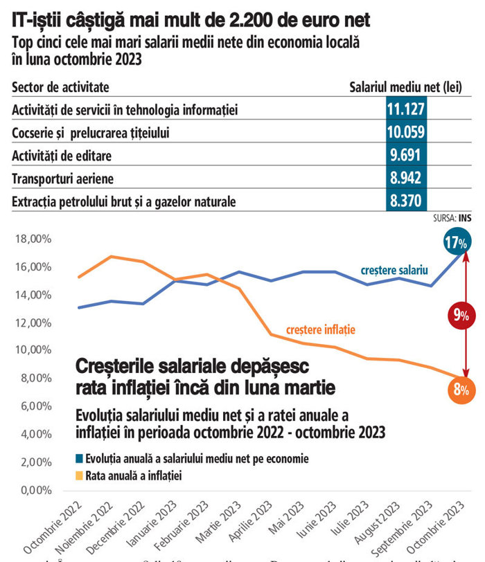 Cea mai mare diferenţă de creştere a salariilor (plus 17%) faţă de inflaţie (8%) de la ultima perioadă. Salariul mediu net a crescut cu mai mult de 17% în octombrie faţă de octombrie anul trecut, până la 4.700 de lei. Inflaţia a rămas, de mult, în urmă la doar 8%