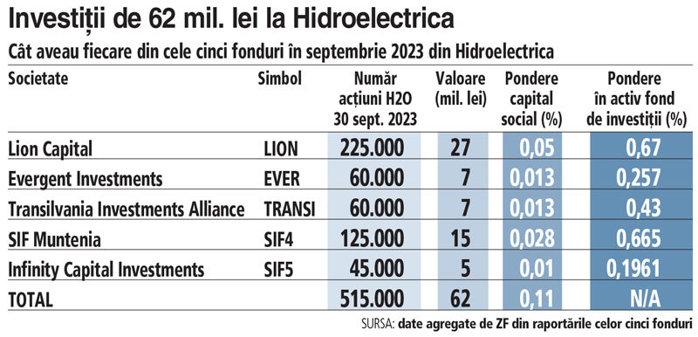Cele cinci fonduri de investiţii alternative de la Bursa de Valori Bucureşti, Lion Capital, Evergent Investments, Transilvania Investments, SIF Muntenia şi Infinity Capital, au investiţii de 62 mil. lei la Hidroelectrica, adică doar 0,1% din companie. Fondurile de pensii private Pilon II au aproape 10%