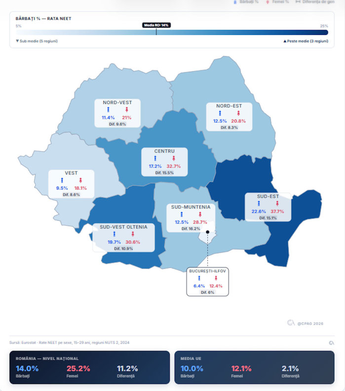 Cine sunt tinerii NEET din România, cei care nu studiază şi nu sunt integraţi pe piaţa muncii: primele victime, cei fără şcoală. Profilul dominant al tinerilor NEET (care nu studiază, dar nici nu au un job) arată că sunt: femei tinere, persoane cu nivel redus de educaţie, tineri din mediul rural, din oraşe mici sau din regiuni cu oportunităţi limitate