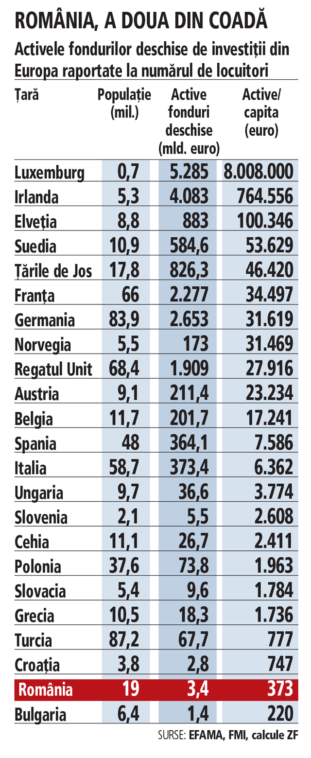 Circa 373 de euro investesc, în medie, românii în fonduri mutuale pe an. Vestea bună: i-am depăşit pe bulgari. Vestea proastă: suntem pe penultimul loc din 23 de ţări. Decalajul încă este mare dacă ne uităm la alte ţări din centrul şi estul Europei