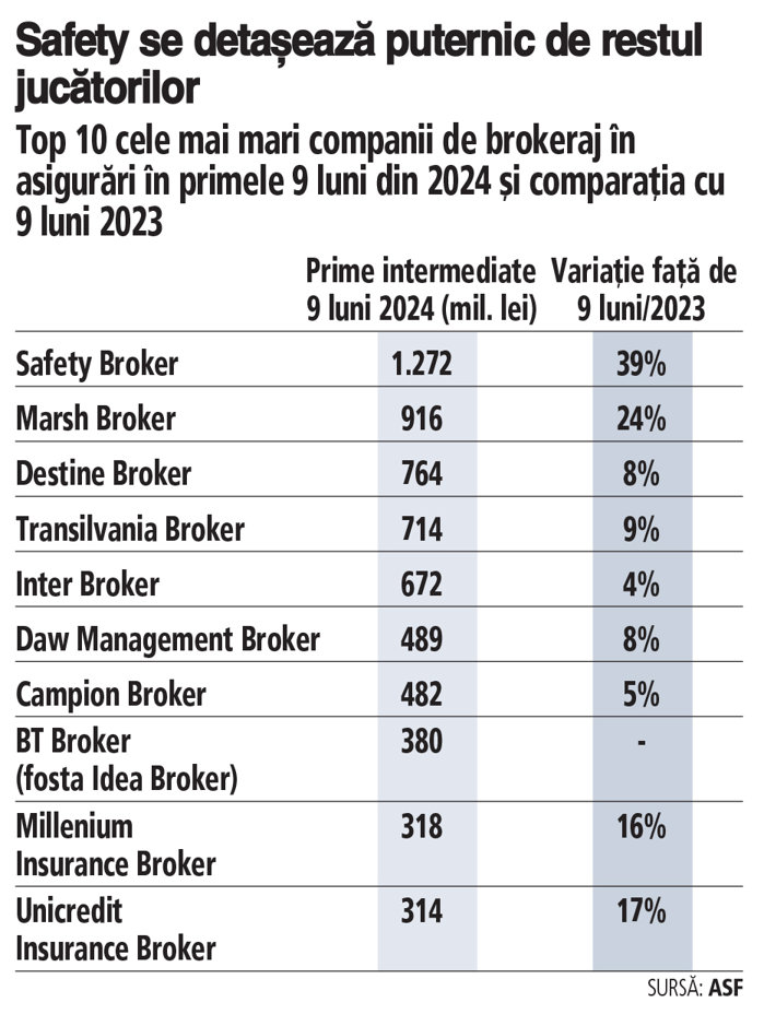 Companiile de brokeraj în asigurări s-au dus la intermedieri de peste 11,7 mld. lei în 9 luni din 2024, în creştere cu 14%. Safety Broker se detaşează puternic de restul jucătorilor, rămânând pe locul 1, urmat de Marsh Broker şi Destine Broker. Gradul de distribuţie din primele 9 luni din 2024 a ajuns la cel mai înalt nivel din ultimii 4 ani, de 69,4%