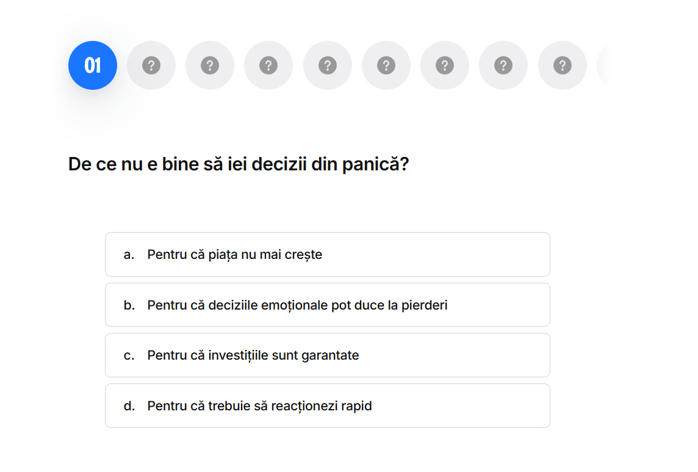 De ce nu e bine să iei decizii din panică? Care este diferenţa dintre cont de economii şi depozit la termen? Ce te ajută cel mai mult atunci când începi să investeşti? Eşti curios să răspunzi?
