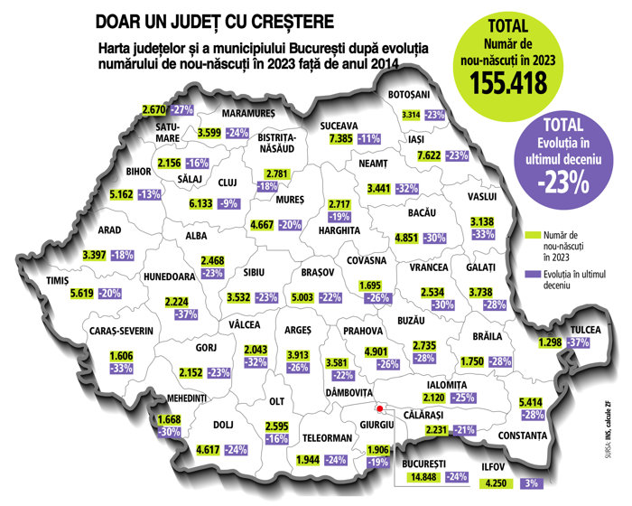 Criza natalităţii în România: Ilfov este singurul judeţ care a înregistrat o creştere a numărului de nou-născuţi în ultimii 10 ani. Cele mai mari scăderi ale numărului de nou-născuţi sunt în Tulcea, Hunedoara şi Caraş-Severin, iar cele mai mici scăderi sunt în Cluj, Suceava şi Bihor