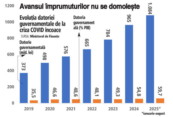 Datoria publică a crescut, doar în august, cu încă 14 mld. lei (2,8 mld. euro). În primele opt luni din an, datoria a crescut cu 119 mld. lei (23,8 mld. euro), ajungând la un total de 1.084 mld. lei (217 mld. euro).