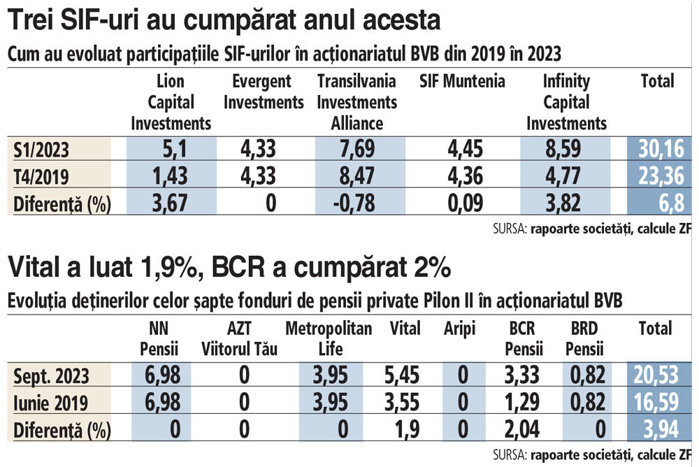 Cum s-a consolidat acţionariatul BVB în ultimii patru ani: SIF-urile au urcat de la 23,4% la 30,2%, iar fondurile de pensii Pilon II de la 16,6% la 20,5%. Retailul a avut fluctuaţii, dar a rămas constant, la circa 19%