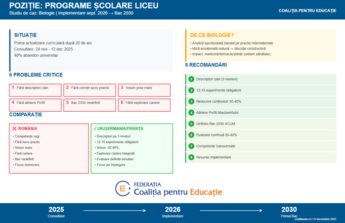 Liceul românesc riscă să rămână blocat într-un model educaţional depăşit, rupt de realitate şi de nevoile tinerilor, avertizează Federaţia „Coaliţia pentru Educaţie”, într-un context în care programele şcolare sunt revizuite pentru prima dată după aproape 20 de ani. Una dintre cele mai mari vulnerabilităţi identificate: lipsa cerinţelor obligatorii pentru activităţi practice şi experimente la biologie şi, în general, la disciplinele ştiinţifice (STEM).