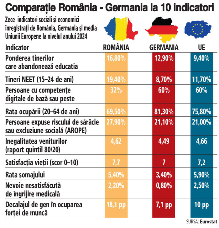 Cum se compară România cu celelalte ţări europene. România versus Germania: diferenţe mari acolo unde se construiesc creşterea economică, educaţia şi forţa de muncă. 10 indicatori