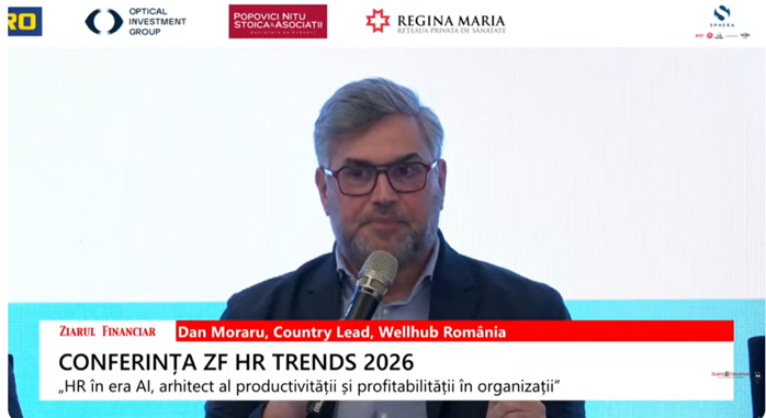 În ultimii 2 ani, politica guvernului pare divergentă cu societatea, având în vedere că TVA pentru zona de wellbeing a crescut de la 5% la 21%, a declarat Dan Moraru, Country Lead, Wellhub România în cadrul conferinţei ZF HR TRENDS 2026. ”Cuvântul anului este ”decizii relevante„. Este un context dificil. Dar soluţia este să iei decizii relevante. Să urmezi intenţia stabilită cu o acţiune. În ultimii 2 ani, politica guvernului pare divergentă cu societatea, având în vedere că TVA pentru zona de wellbeing a crescut de la 5% la 21%, ceea ce arată care sunt priorităţile. Guvernul este până la urmă HR companiei numită România”.