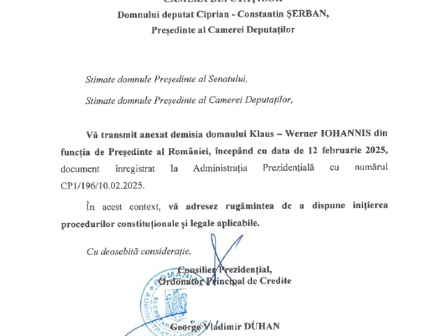 Demisia preşedintelui a ajuns la Parlament. Cum arată scrisoarea de 3 rânduri prin care Klaus Iohannis părăseşte funcţia de şef de stat după 10 ani şi aproape două luni de la prima învestire. DOCUMENT
