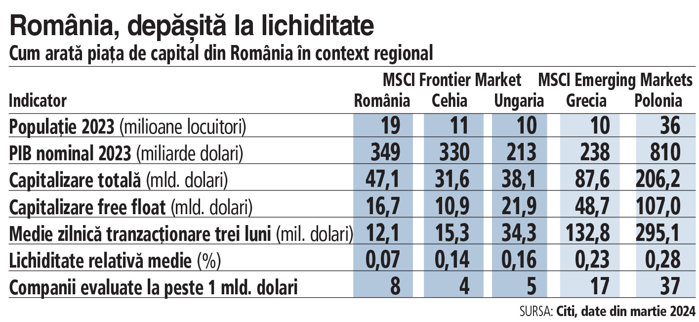 Dimensiunea bursei din România este mult sub cea a Poloniei şi mai mare decât cele din Cehia şi Ungaria, dar la lichiditate este depăşită de toate trei. La BVB sunt listate opt companii de peste 1 mld. dolari capitalizare, faţă de patru în Cehia, cinci în Ungaria şi 37 în Polonia