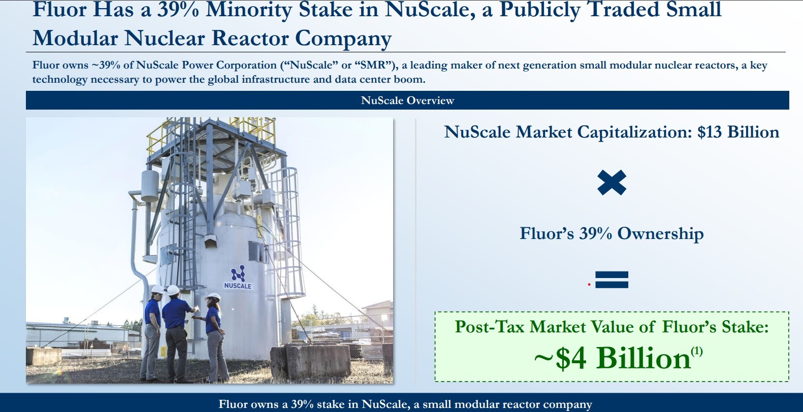 Conglomeratul industrial texan Fluor, cel mai mare acționar al companiei americane NuScale, dezvoltatoarea și proprietara tehnologiei reactoarelor modulare mici (SMR) cu care România ar putea construi o centrală nucleară de 462 MW la Doicești, pe amplasamentul fostei termocentrale pe cărbune de acolo, este îndemnat de către unul dintre cei mai grei oameni de pe Wall Street să-și vândă integral deținerea rămasă la NuScale, conform datelor Profit.ro.