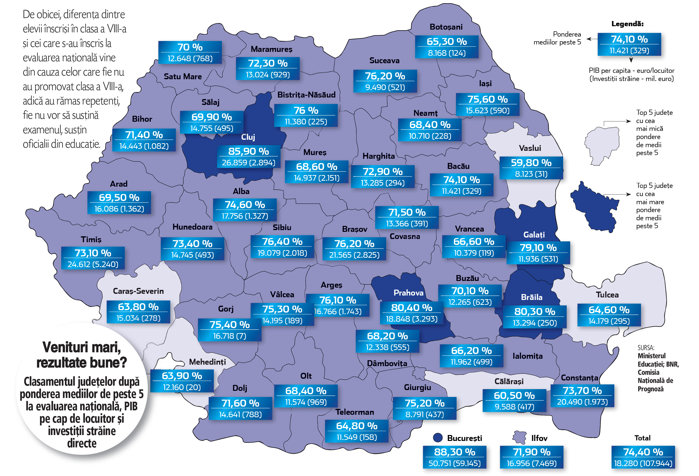 ♦ Brăila, Galaţi şi Gorj sunt în top 15 judeţe cu cele mai multe medii peste 5 la Evaluarea Naţională, deşi PIB-ul pe cap de locuitor şi investiţiile străine directe nu par să susţină aceste rezultate. ♦ În Timiş, un judeţ cu un PIB pe cap de locuitor de 24.600 de euro  şi investiţii străine directe de 5,2 mld. euro, puţin peste 73% dintre elevii de clasa a VIII-a au reuşit să obţină o medie peste 5 la evaluare. ♦ În Iaşi, 75,6% dintre elevi au luat peste 5, la un PIB per capita de peste 15.600 de euro şi investiţii străine de 590 mil. euro, iar în Bihor ponderea mediilor peste 5 este de 71,40%, la peste 14.400 de euro pe cap de locuitor şi investiţii străine directe de 1,08 mld. euro.