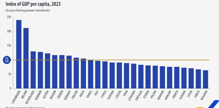 Eurostat: România se află pe poziţia 21 din cele 27 de state membre UE la valoarea PIB per capita, depăşind Ungaria, Croatia, Slovacia, Letonia, Grecia şi Bulgaria