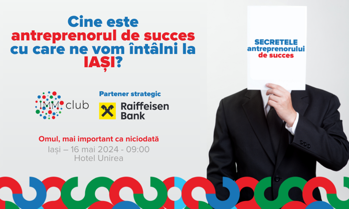 IMM Club organizează la Iaşi evenimentul „Secretele antreprenorului de succes - SAS 2024”, pe 16 mai, ora 9:00, la Hotel Unirea. IMM Club organizează la Iaşi pe data de 16.05.2024, ora 9:00 la Hotel Unirea, evenimentul ”Secretele antreprenorului de succes - SAS 2024”. Evenimentul va avea ca temă principală ”Omul, mai important ca niciodată”.