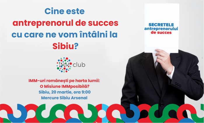 IMM Club organizează la Sibiu evenimentul ”Secretele antreprenorului de succes - SAS 2024”, pe 20 noiembrie, ora 9:00 la Hotel Mercure Sibiu Arsenal. Evenimentul va avea ca temă principală "IMM-uri româneşti pe harta lumii: O Misiune IMMposibilă?", este organizat cu sprijinul Bolt Business, partener de mobilitate, iar partenerii media sunt Ziarul Financiar şi Contzilla.ro.